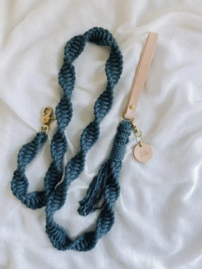 EMBER & IVORY Macrame Leash - Teal - Spiral - Natural Leather Caramel Handle
