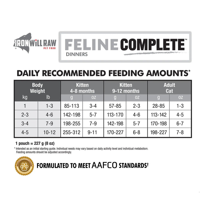 Iron Will Raw Feline Complete Rabbit, Pork & Mackerel Dinners for Cats is formulated to meet the AAFCO