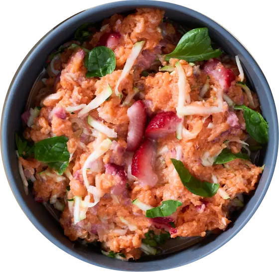 Packed with 46% fresh raw salmon, and Omega-3s to boost brain function and promote a shiny coat. This raw meal provides essential vitamins, while offering a burst of antioxidants to support immunity.