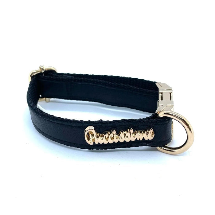 Our stylish "Raven" dog collar from our brand new “Raven” collection is made with high quality black faux leather and gold metal hardware. Not only hoomans want to feel elegant, their pooches too!